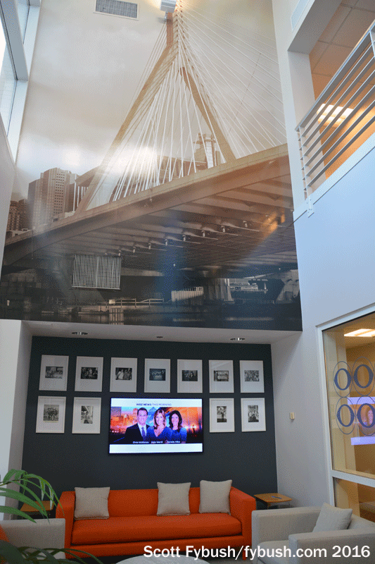 New to us this time, however, was the big “CBS Boston” signage out by the roadside – and a new paint job and spiffy murals in the lobby.