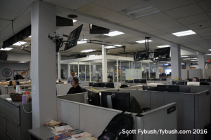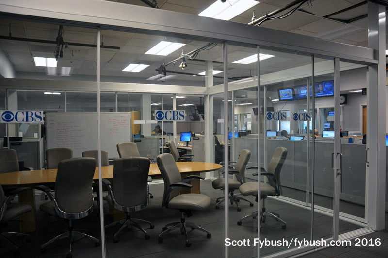 The radio studios that were brand new as part of the 1996 newsroom expansion are still here and still largely unchanged, save for some new logos on the wall. Outside the line of studios, there’s been yet another change in the newsroom: the space that separates the radio and TV news cubicles is now a glassed-in conference room, replacing a weather pod that used to sit here (and a raised TV flash desk that was there even earlier!)