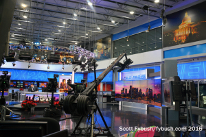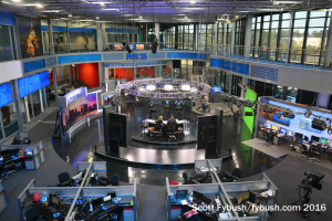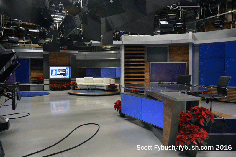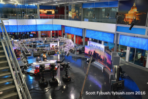 Also new since that visit is a spiffy new set in the middle of the big atrium newsroom, as well as a new station logo. It’s a very photogenic set, with lots of interesting angles and giant flatscreens to keep the newscast moving along visually.
