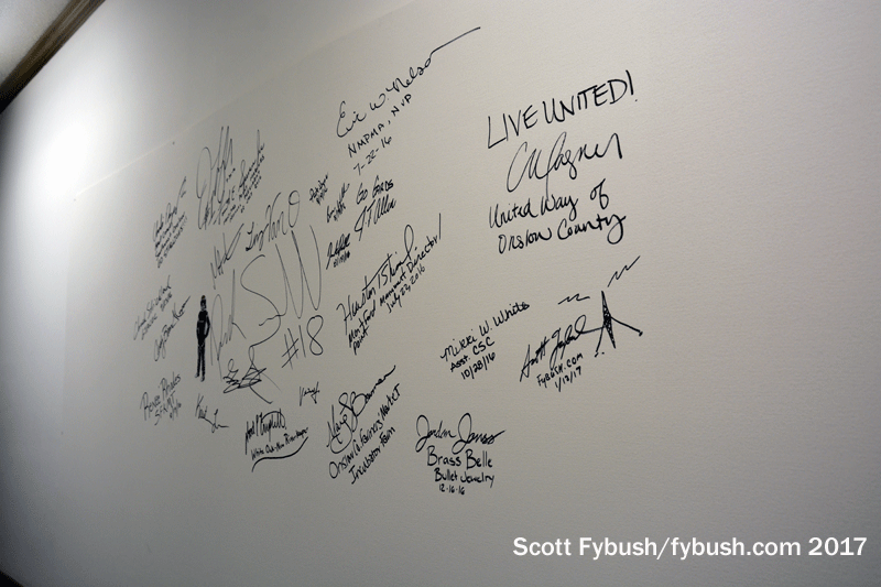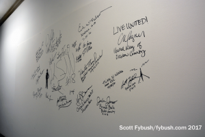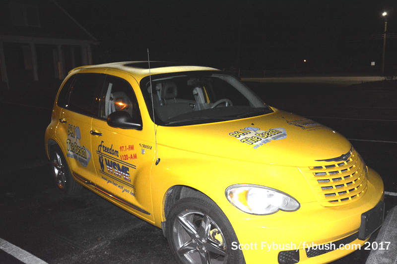 After signing the Wall of Fame in the hallway outside the studio and admiring the PT Cruiser outside with both stations’ logos, we’re off in the dark to see transmitters.