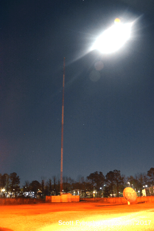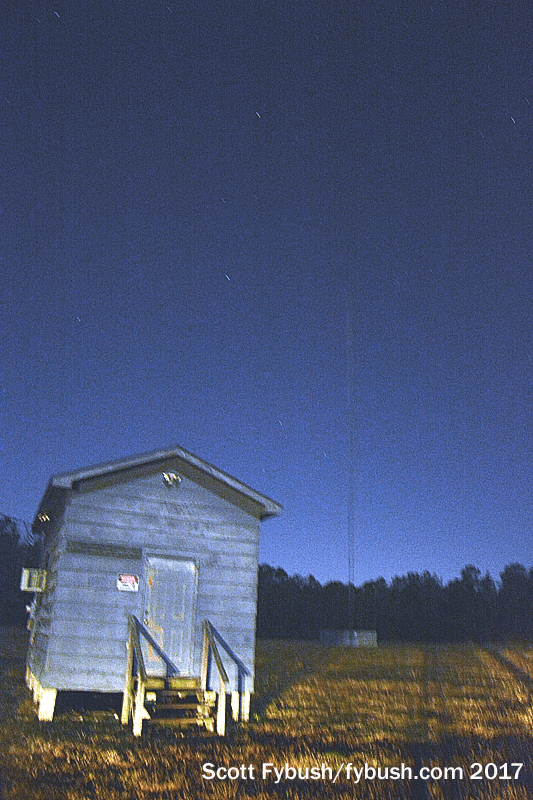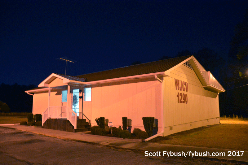 It’s hard to see in the dark, but WJCV’s translator, W252BO (98.3 Pumpkin Center), is mounted up near the top of the single AM tower, which carries 5 kW by day and 47 watts at night.