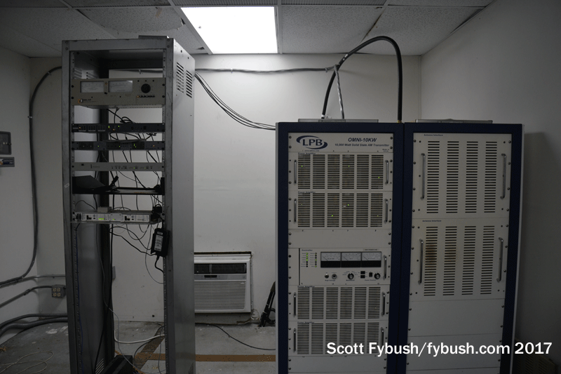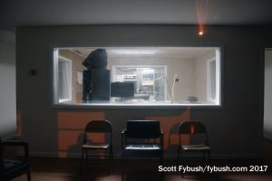 Even without anyone home, we get a sort of mini-tour just by peering in the window, where the studio sits right off the lobby, with a window in turn looking back into the Harris transmitter in the back room.