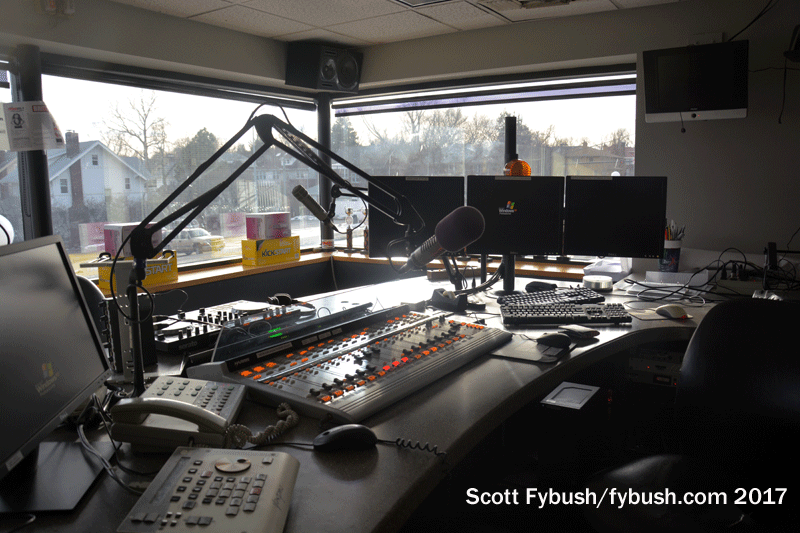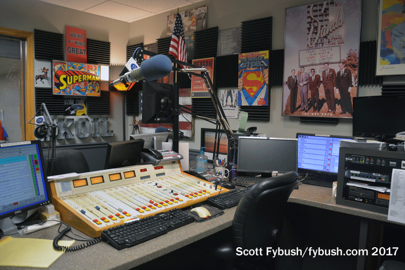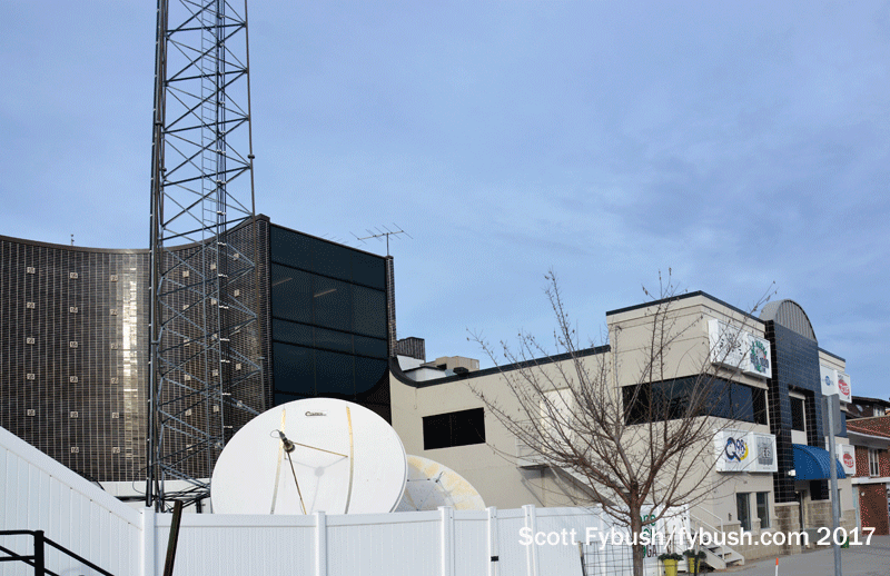 The regional group NRG Media is the owner here these days, and it’s filled this former bank building with a cluster of four AMs and three FMs that includes the market’s legendary AM top-40 station, KOIL (1290), which is back to its heritage calls now after a couple of decades as KKAR. The studio for its talk format is on the middle floor of this building, behind the lobby where videos from each station are cleverly projected on the wall near the reception desk.