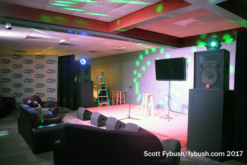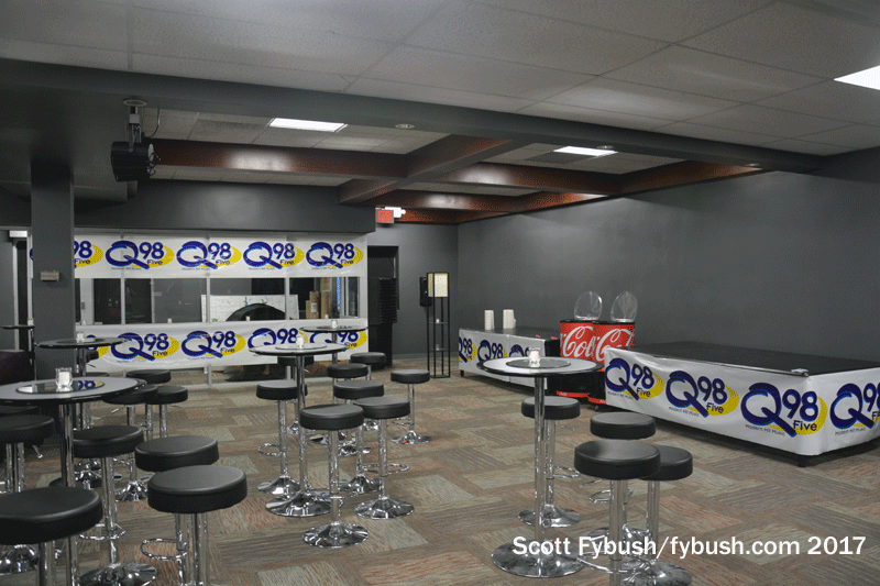 This is one of those clusters that really gets the value of events as a source of non-traditional revenue for radio, and they make a lot of use of both this space and outside venues. There’s a green room for performers, a logo wall for pictures with fans, and a top-notch sound and video system so that the performances here can go right to each station’s digital presence. And it’s got its own separate entrance on Dodge so that listeners can come in and out down here without any disruption to the studios and offices upstairs.