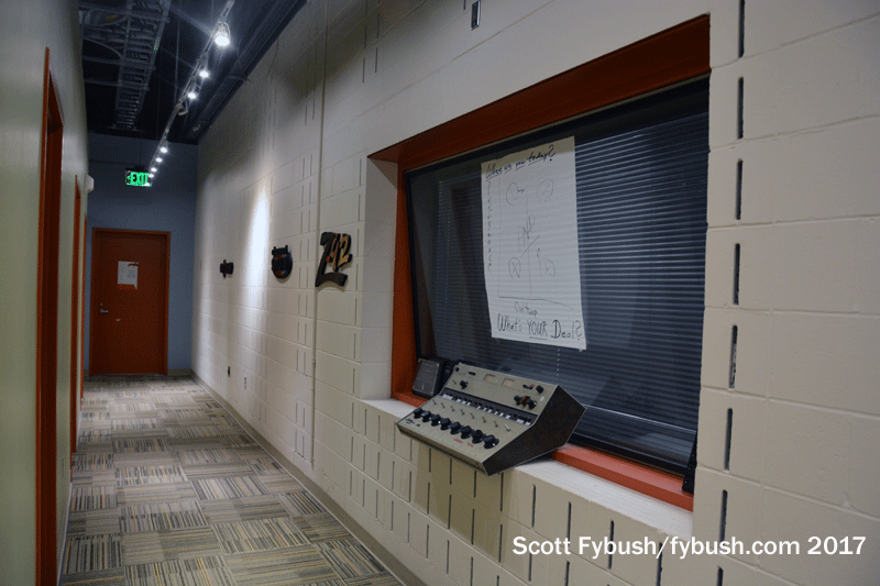 When the radio cluster moved in, it took over office space in the front, on the left side of the building. Its studios, however, went into the opposite back corner, where a former TV studio became the high-ceilinged box inside which two rows of new radio studios were built.