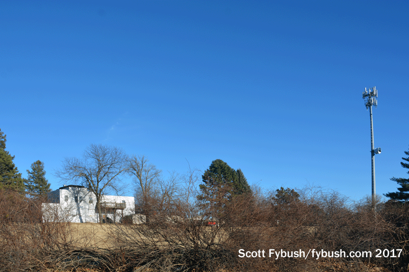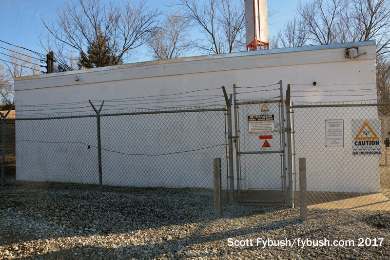 There’s an FM tucked in here, too: BBN religious outlet KYFG (88.9) has its transmitter in the building and its antenna on the tower.,