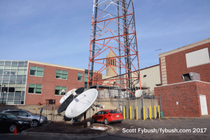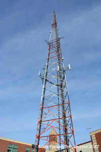 Before we could even think about leaving Omaha at the end of our February visit, there was one site we knew we couldn’t possibly miss. After 50 years of broadcasting from the middle of the University of Nebraska-Omaha campus on Dodge Street, the tower that carried public broadcaster KYNE (Channel 26) was removed this spring, and so we were eager to pay one last visit to the site before it made way for more construction on this busy campus.