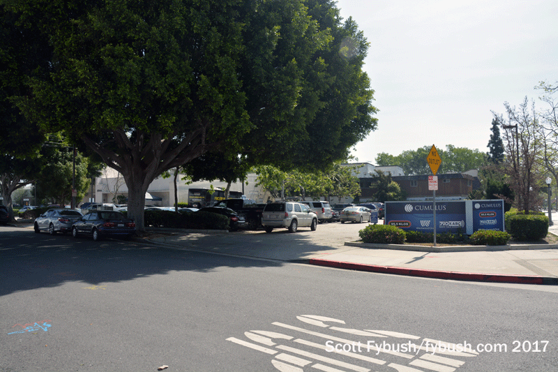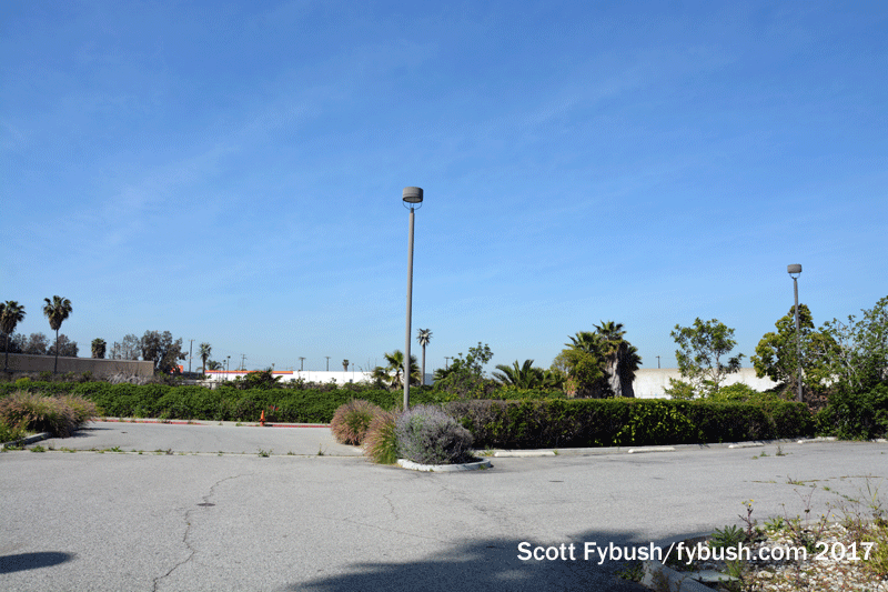 Nature takes over fast in southern California, and by the time we pulled up at the locked gates on La Cienega Blvd. one morning, the parking lot was already sprouting weeds, the landscaping was overgrown and most of the signage was gone from the building, if not yet from the big roadside sign. You’d never know there had been two towers here, either. And now you’d never know KABC and KLOS had been here at all; since we took these pictures, the building has been razed and the property is now getting ready to be redeveloped into a dense new commercial-residential mixture just steps from the LA Metro.