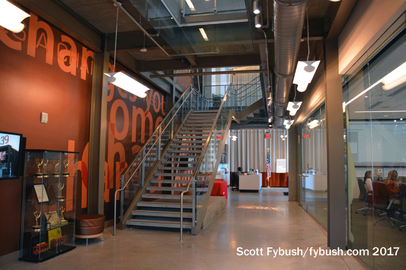 Standing in the lobby and looking up, an alert visitor notices what appear to be radio studios up above – and indeed, they are: those are the old WFMZ-FM studios, though there hasn’t been a WFMZ-FM since the 1997 sale of the 100.7 facility to Citadel. (It took another heritage set of Lehigh Valley calls, becoming WLEV-FM; the former WLEV-FM on 96.1 is now “Cat Country” WCTO.)