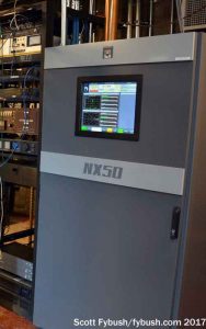 Back out here to Parker Road: the open-wire transmission line is long gone, replaced by buried coax. The GE transmitter is long gone, too, leaving behind a relatively empty room with a Harris DX50 at one end and the current Nautel NX50 transmitter tucked away next to the STL and processing rack.