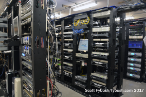 Across the hall on the other side of the “U” that makes up the back of the studio complex, there’s a spacious rack room (with one of the racks facing out into the hall so staffers can access equipment they need while the rest of the room stays locked) – and out back, in a yet-to-be-developed part of the Penn Field complex, is what has to be the biggest station garage I’ve ever seen, dwarfing the promo vehicles stored out there.