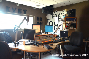 The music stations in the cluster are off to one side of the building, lined up in the typical iHeart pod arrangement that gives each station a main air studio and an adjacent production room/call screening area. KVET-FM (98.1) is one of two country stations in the group, paired with sister KASE-FM (100.7); another pod is home to top-40 KHFI (96.7 Kiss FM) and its rhythmic sister KPEZ (102.3 the Beat).