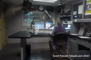 Around the back side of this studio cluster, a former conference room was recently rebuilt as a really nice-looking talk studio, primarily for the benefit of WUCS’ afternoon Rob Dibble talk show. There’s a desk with spiffy lighting, a video wall and a comfy pair of leather chairs for more intimate interviews, all looking out toward the downtown skyline.