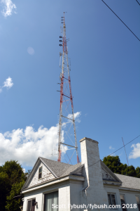 This tower (and another shorter one next door) sits right in the middle of the big tower farm here – just to the east is the Galaxy/EMF tower with WKLL (94.9) and WKVU (107.3) on it, just to the south across Grace Road is the WKTV (Channel 2) studio and the tower out back with several rental tenants, just to the west at the corner of Grace and Smith Hill Roads is WUTR (Channel 20)/WFXV (Channel 33)’s studio and tower, and three more FMs sit on two towers on the west side of Smith Hill Road.