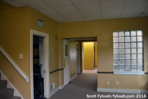 The front parts of the building are even newer, and the second floor was also added on sometime after 1938; today, it’s all just empty offices, though it’s still easy to pick out the big wood-paneled office upstairs that once housed the station’s general manager.