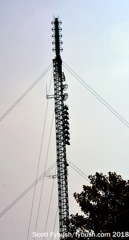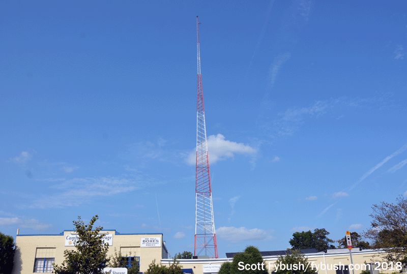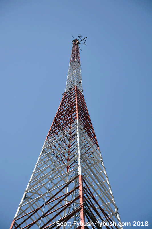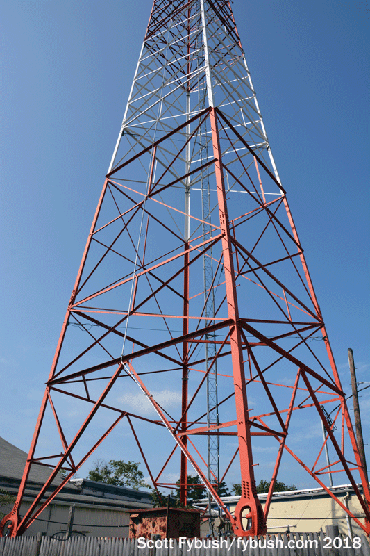 First stop on this sunny August morning was in downtown Lawrence, where an unsual bit of history continues to tower over Amesbury Street. Way back in 1937, WLLH in nearby Lowell received FCC permission to put up a synchronous on-channel booster here in Lawrence, and today it’s one of only a tiny handful of such synchronous AMs remaining. Not long ago, WLLH’s current owners came close to shutting off their Lowell signal and making Lawrence the primary transmitter, but that plan was scuttled, and now “Mega 95.1” continues to be heard in both cities, as well as on an FM translator over in Lowell. (Read more about the early days of WLLH in this nifty station booklet over at American Radio History!)