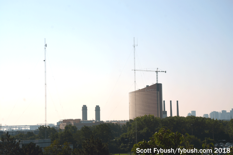 But this isn’t “Casino of the Week,” it’s “Site of the Week,” and the point here is that those two towers in the foreground are Everett’s AM station, WKOX (1430), the former WXKS (AM). They now also carry a diplex partner, WILD (1090) – and this picture was taken from the current iHeart studios nearby at 1 Cabot Road, right on the spot where the old WILD 1090 tower once sat back in the day. (We’ll see it in more detail in an upcoming installment.)