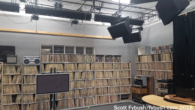 That studio was still under construction when we stopped by (and the transmitter site hadn’t been built yet), but we got the tour of the rest of PCTV’s spacious and well-equipped plant, including a studio where the curtains hide a secret – check out the WTBR record library, which now lines the walls of the big TV studio!
