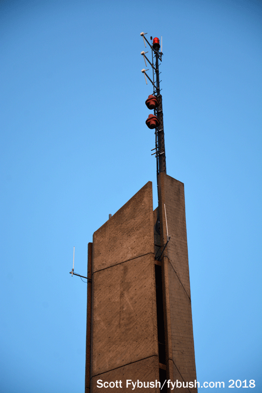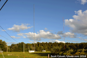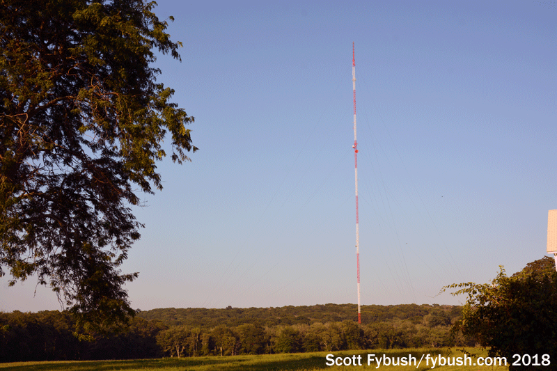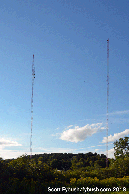 After spending a night in Providence (and enjoying some nice seafood), we headed back home the long way the next day, checking out some signals in north central and western Massachusetts and grabbing IDs that you’ll hear soon on Tophour.com – and eventually winding our way down through the Berkshires to end up along US 20 in Pittsfield. The lovely late-afternoon summer light showed off two of the three AMs in town – WUPE (1110) and WBEC (1420) are now both owned by Townsquare Media, with studios at the WBEC site (albeit on the other side of the property from this southern view, which also showcases the aux antenna of WBEC-FM 95.9.)