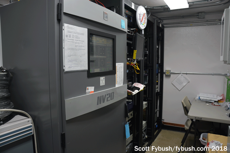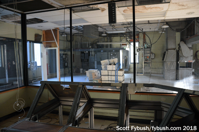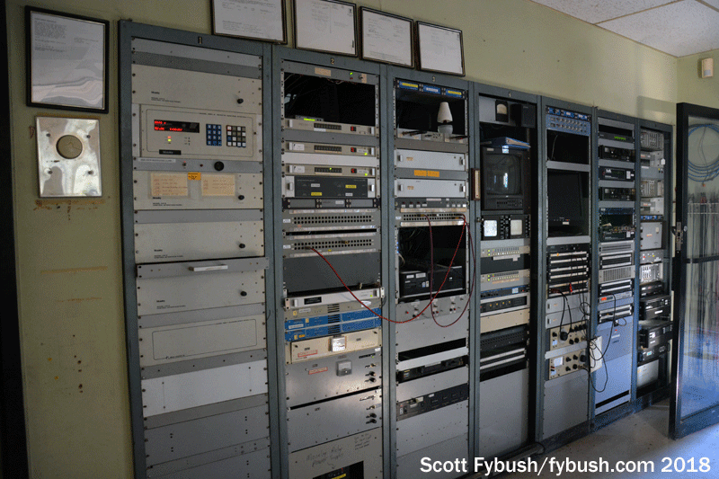 Upstairs, the old WTEV/WLNE transmitter room has been mostly emptied; there’s nothing left of the channel 6 analog transmitter, though some racks of old STL equipment still sit silently in the control room.