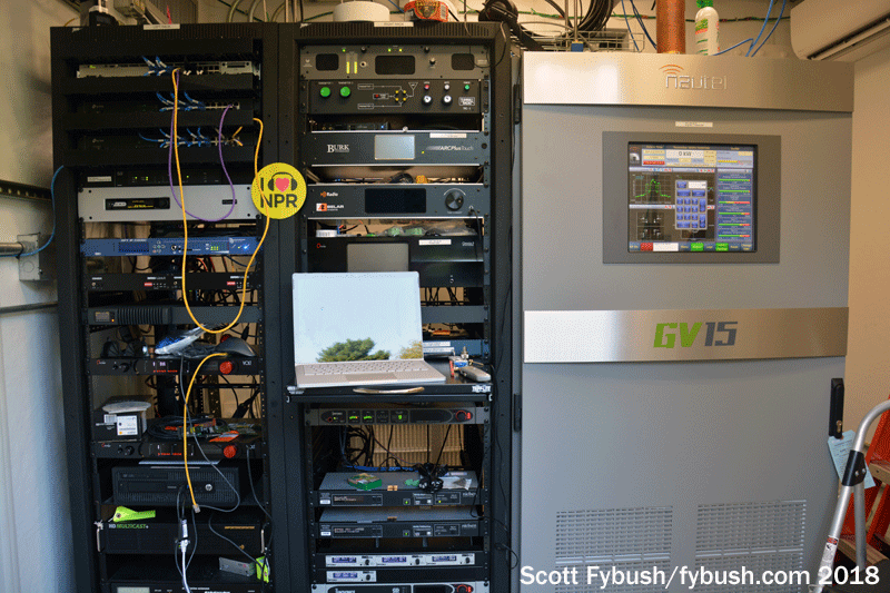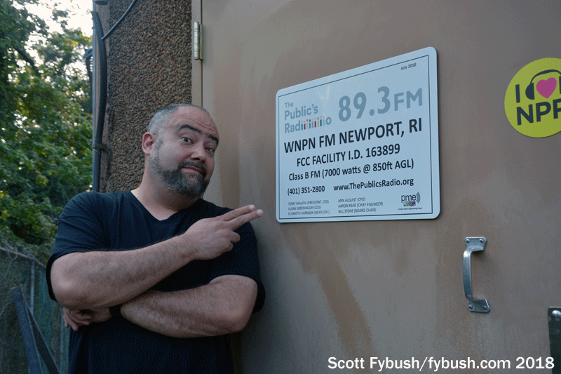 So why are we in here and what does it have to do with The Public’s Radiiiiiiiiiiiiiio? Back in the summer of 2017, then-RIPR beefed up its lineup of signals by acquiring WUMD (89.3 North Dartmouth MA) from UMass Dartmouth. Renamed WXNI, that signal provided more robust coverage for the network east of Providence – but there was room to make it even bigger, and so Aaron and his team moved swiftly to apply to move 89.3 here to Tiverton. With a new city of license of Newport and a new set of calls, WNPN, the new class B1 signal from Tiverton was just about to hit the air when we stopped by to see the new Nautel transmitter in the old MediaFLO enclosure at the WLNE compound and the new Shively panel antenna up near the top of the tower, just under the old channel 6 antenna that still sits up top. (Why use the enclosure instead of the old WLNE building? Easier to control heating, cooling and access…)