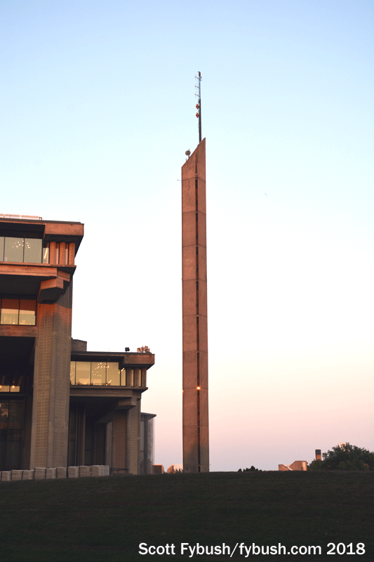 This was still the University of Southern Massachusetts when its first radio voice signed on in 1974. WUSM was on 91.1, transmitting from the top of the distinctive concrete campanile tower that was already a landmark at the center of the oh-so-late-sixties Brutalist concrete campus.