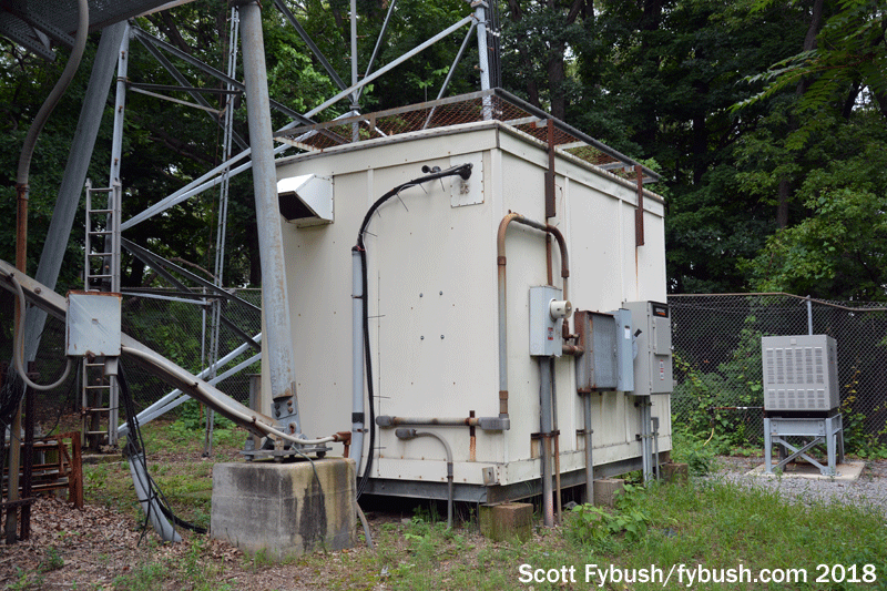 WXXI built its new transmitter up along the shores of Irondequoit Bay northeast of Rochester, at a site it had owned since the mid-1970s when it needed a remote location for a huge downlink dish for the new PBS satellite delivery service. The dish still sits there, and the tower that once held the microwave link back to the downtown studio now hosts the two-bay antenna for the translator, whose transmitter sits in a rack inside the little prefab building at the base.