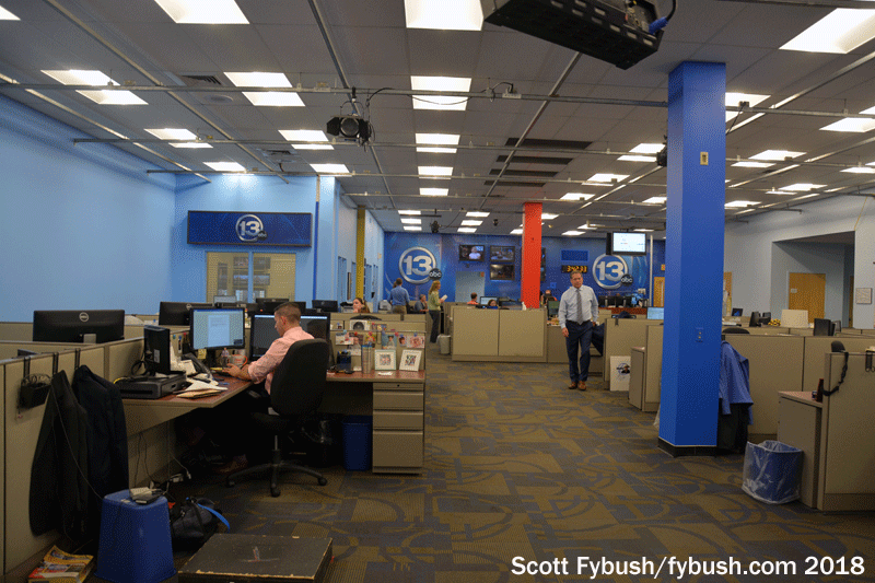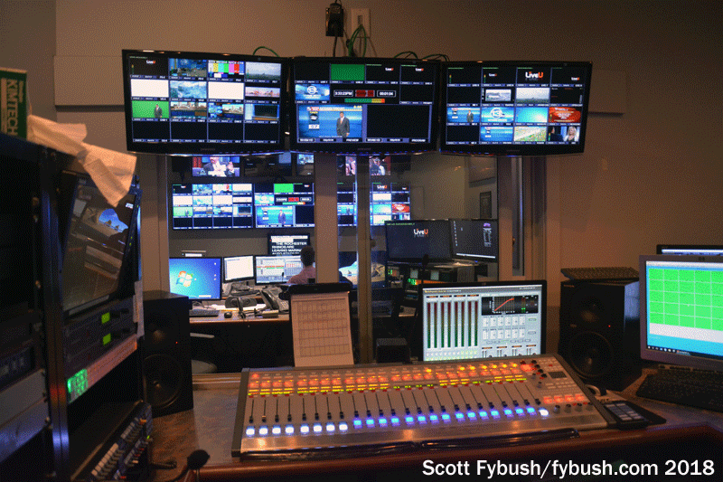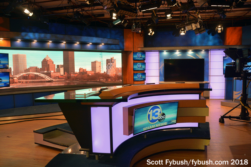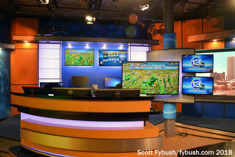 The window that once looked into the studio has long since been blocked off by the latest set redesign, and it’s a remarkable one: this is a small, fairly low-ceilinged space that was never designed as a TV studio originally, and WHAM-TV gets more versatility out of its set here than a lot of stations with twice the space. The studio had a recent refresh with a new monitor wall behind the main anchor desk, while the morning show, especially, makes tremendous use of that “BAM” monitor you see in the background at right.
