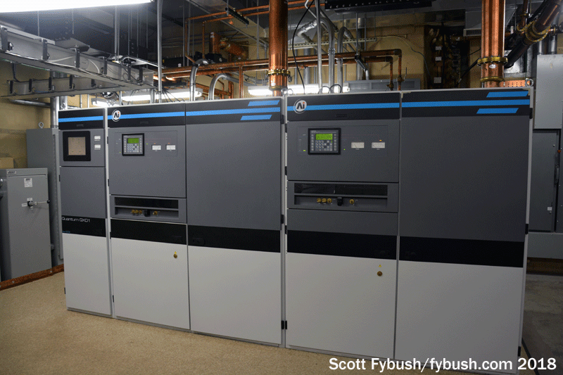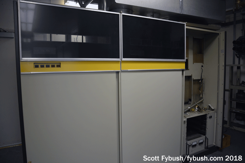 Two buildings over from WXXI is the similar-looking brick building of Rochester’s ABC affiliate, WHAM-TV (Channel 13), and we stop upstairs there for a quick “before” peek. This is an unusual room here, because it still contains every transmitter Channel 13 has used since it signed on in 1962 as WOKR. That massive original 1962 RCA transmitter still has pride of place in the middle of the room, with the G-Line RCA that succeeded it built into a wall to the left. To the right is the current solid-state Larcan that powers WHAM-TV’s current digital signal on RF 13, but not for much longer – WHAM-TV will be repacked to RF 9 soon.
