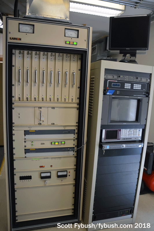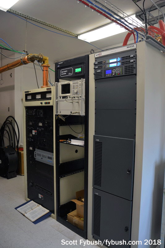At WXXI’s building, there’s been plenty of rearrangement since our last visit. WXXI-TV (Channel 21) had a catastrophic failure of its old Thales transmitter a few months earlier, and delivery of its new repack transmitter, a GatesAir Maxiva, was moved up to get the signal back on the air at full power faster. That transmitter will move from WXXI’s current RF 16 to its repacked channel, RF 22, later on – but for now, it’s chugging along on 16 from a spot behind the old Thales, in what used to be the transmitter row for WXXI-FM (91.5). WXXI-FM’s old Harris still sits here as a backup (its predecessor, an even earlier Harris, was scrapped out to make room for the Maxiva); the current main WXXI-FM transmitter, another GatesAir, sits across the room, facing the transmitter row for WRUR (88.5). (Look closely above and you can also see the rack on the right for W234AZ, the 94.7 translator for Family Life Ministries’ regional network.)