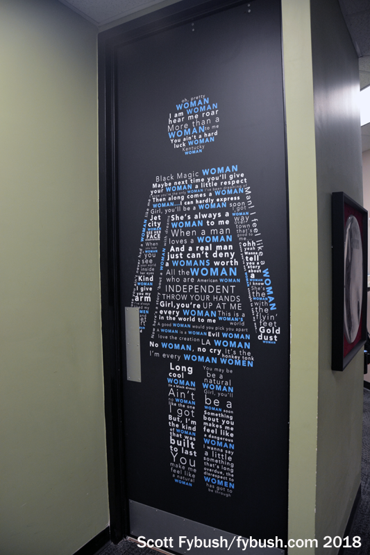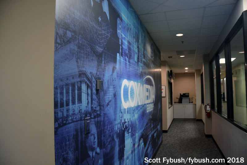 One more wall wrap finishes off our studio tour: that Cox Media mural chronicles the long history of this company, going back to its early newspaper days under its founder, Ohio governor James Cox. What will fill this wall once Cox sells off its radio stations?