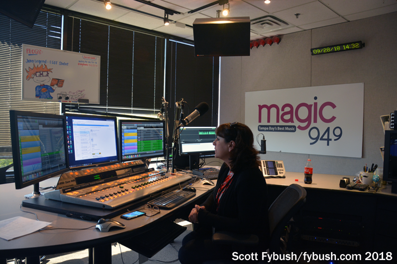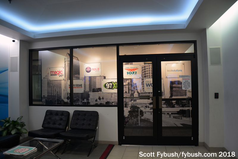 What’s that in the frame? A satin jacket from an earlier incarnation of 107.3, which was the original home of WWRM when the “Warm” AC format launched in 1988. Today, the WWRM calls are down the dial on 94.9, where the AC format is now “Magic 94.9,” the latest use of the FM facility that started 50 years ago right around the corner from here on Gandy Boulevard. (Back then, it was WLCY-FM, sister to WLCY 1380 and ABC affiliate WLCY-TV 10; the 1380 towers and the channel 10 studio are still over there on Gandy.)