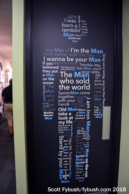 The decoration around this building is a huge step up from most of today’s generic-ish cluster compounds. In the staff lounge/cafeteria near the performance studio, there’s a tower beacon salvaged from the Bone’s transmitter site (which we’ll see shortly). Need to make a pit stop? The doors to the bathrooms are also wrapped – and do click on these to examine them in detail, because each of those graphics is made up of lyrics from songs that feature “woman” and “man” in their lyrics. The goal here is to make sure you know you’re in a radio station and not an insurance agency – and it works.