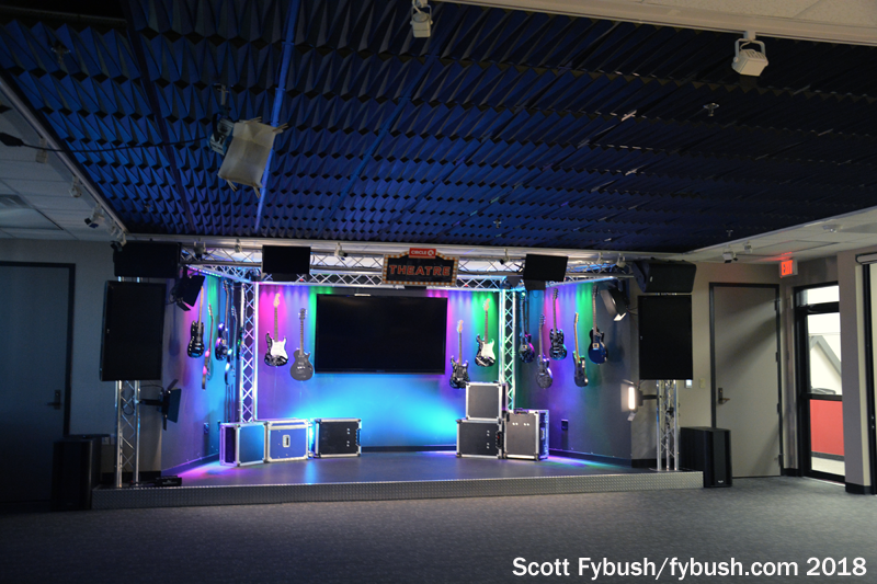 For instance: if we’d walked into the lobby in 2011 and turned down the hallway, we’d have seen a nondescript conference room. Now, of course, everybody has a performance studio in their building, and Cox is no exception: a little riser for a stage, some lighting and video screens and a few cameras – and presto, that conference room is now a spiffy performance area/meeting room, complete with audio and video control at the far end and a nice kitchen space for food service.