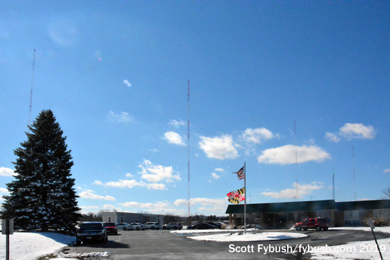 And what’s that right around the corner up the hill? The four-tower array of Frederick’s other AM station, WFMD (930), which had gone from iHeart to a divestiture trust and had just recently been sold to Connoisseur when I drove by. Its studios, shared with country FM sister WFRE (99.9), sit next to the towers – and look carefully in the distance between the WFMD array and the building: there’s WWFD’s two towers in the background!