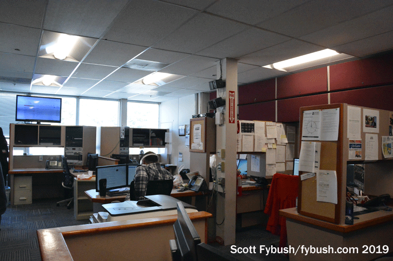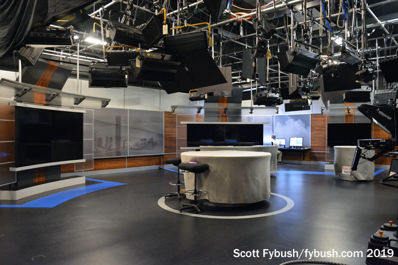 That studio work is long since finished, so we finally got a peek inside the TV studio at the south end of the building, which adjoins the big newsroom (in what I think was originally a TV studio itself when this facility was built.)