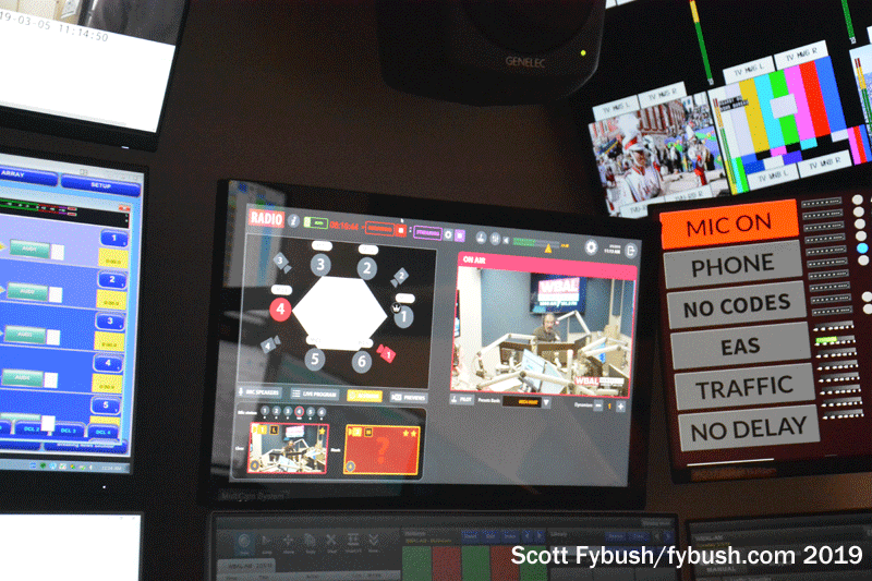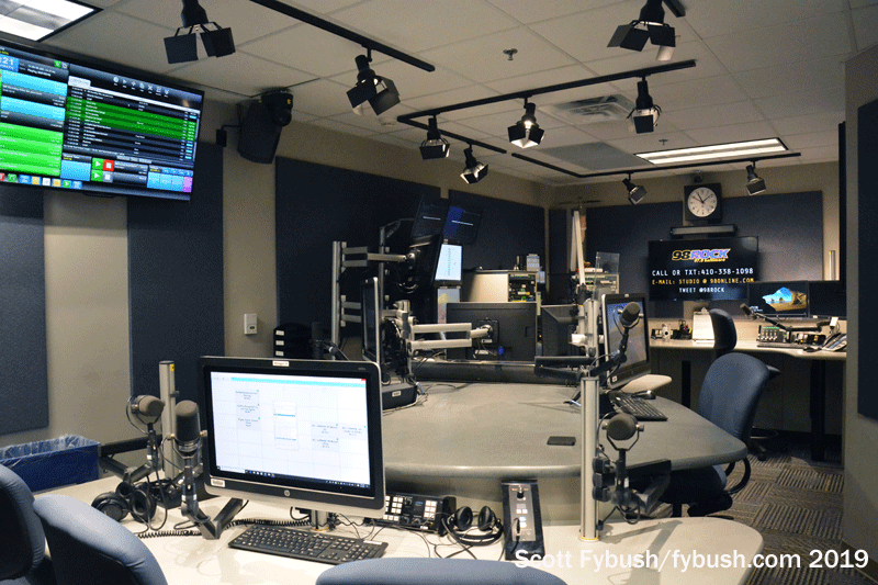 This is one big room now, serving as both control room and as a large air studio for the “Justin, Scott and Spiegel” morning show and the rest of WIYY’s programming, including its Baltimore Ravens broadcasts. There are video screens everywhere, showing outside cameras, the automation screens, video feeds from WBAL-TV and more – and at the heart of it all (just as at WTOP and Hubbard) is a Wheatstone control surface. The furniture is modular, making it easy to move seats around depending on whether it’s the rock morning show, the Ravens pregame or whatever else 98 Rock needs to do in here.