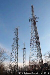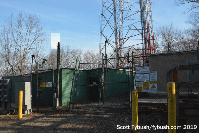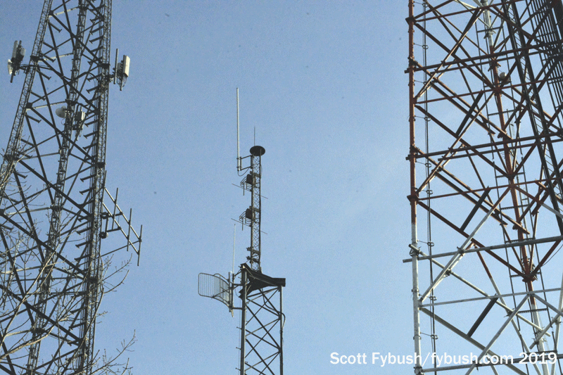 That’s the original WYBC-FM antenna (I think) from 1987 on that center tower, later replaced by a newer one-bay antenna on the tower to the right. This compound in the middle of West Rock State Park is also home to several translators – the “Bomba” 102.3 relay of Full Power Radio’s Spanish hits network, iHeart’s “100.9 the Beat” (fed by WKCI 101.3-HD2), a Connecticut Public Radio relay on 89.1 – and the one we at Fybush Media helped do for WFIF (1500), W270DL on 101.9.