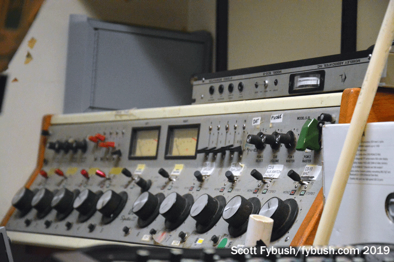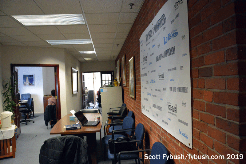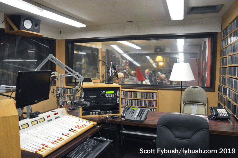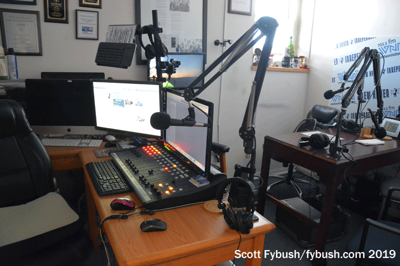 And we close with one more community station, on a smaller scale: in the heart of downtown New Haven, up a steep flight of stairs from Elm Street, WNHH-LP (103.5) operates from studios in the bustling offices of the New Haven Independent and La Voz community news organizations. The “Independent” operates WNHH in English for most of the day from the small studio shown above, but there’s also programming from La Voz in Spanish, coming from a bigger studio at the end of the hall.