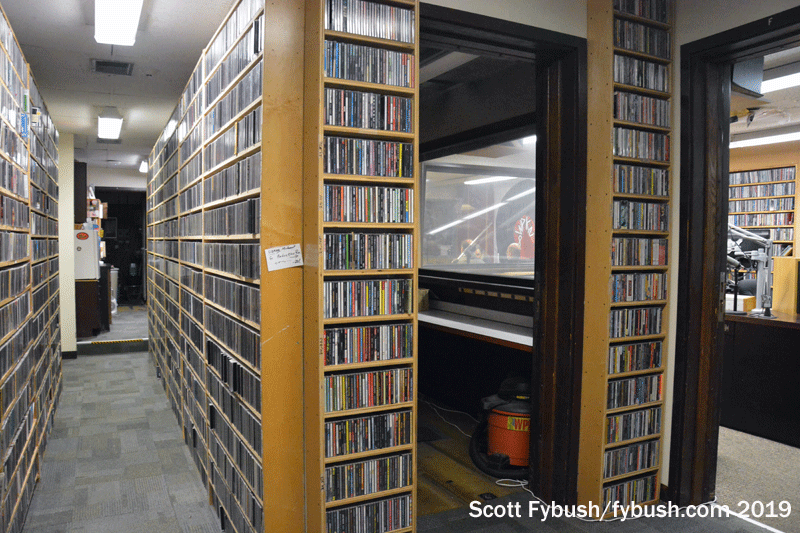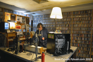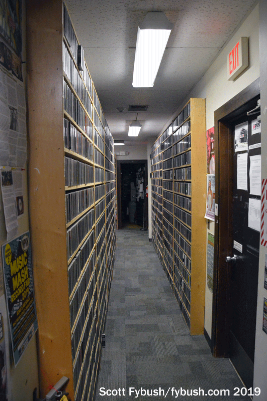 At the other end of the line of studios is what’s still labeled on the door as the “AM Studio,” a relic of the early days when the university had a carrier-current AM station alongside the noncommercial FM; these days, this room is used for production and pre-recording. Beyond that are station offices and a crowded record library. You never know just what might be getting pulled from these shelves and getting spun on the 89.5 airwaves (and these days, on the stream that has a worldwide following…)