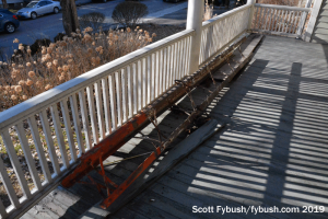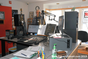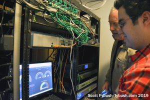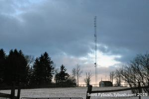 We didn’t get inside the transmitter building on this visit, but there’s a new Nautel transmitter in there replacing the aging Energy-Onix that powered WVBR (the “Voice of the Big Red”) for many years, and a new 4-bay ERI antenna up on the tower helping the signal to get out better across the southern Finger Lakes.