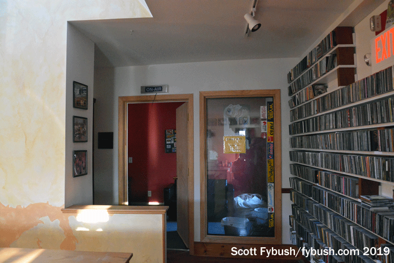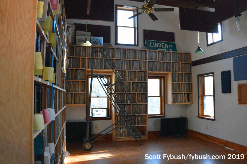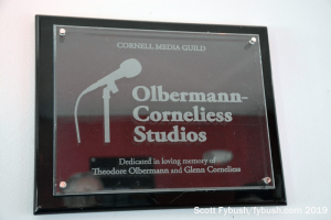 This building was, rather famously, made possible by a donation from one of WVBR’s most prominent alumni, Keith Olbermann, who named it for his father and for one of his Cornell colleagues who died too young, Glenn Corneliess. The dedication plaque still hangs in the building, of course, where the big “Studio A” with its vaulted ceiling has been home to lots of live music within these walls lined with the station’s vinyl collection.