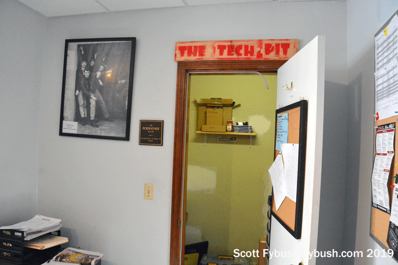 This is a commercial station run by a board made up of students and alumni, not a college-owned station, and so there’s a long, proud history here of homebrewing technology. Within the “tech pit” room behind the main air studio at the opposite end of the building from Studio A, one of the student engineers is proudly showing off the monitoring system WVBR built to keep tabs on its new transmission system – and after a quick look around upstairs at some of the station’s history and the studio for the student streaming outlet, CornellRadio.com, we’re off to see the new tower.