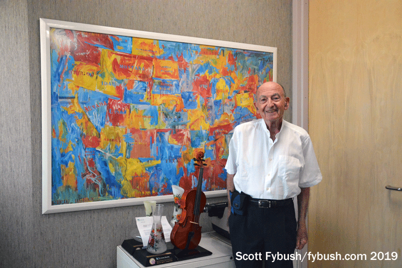 No elevator for this nonagenarian – after a visit to his storage closet to pull out a bottle of wine from one of the vineyards he owns, he’s beating me down the stairs to the studios on the floor below, all in a neat line just off a big office/bullpen area.