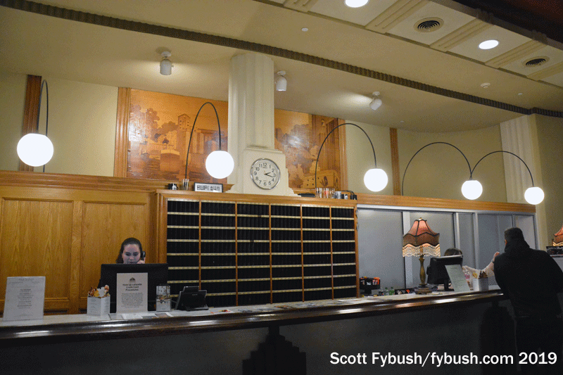 We’d heard that the old WNED studios were largely intact on the top floor of the Lafayette well into the 1990s, but they’re gone now – the hotel has gone through a massive renovation, which we got a peek at during an Open Doors Buffalo event last summer. Imagine the days when UHF TV pioneers made their way through this lobby in the early 1950s…