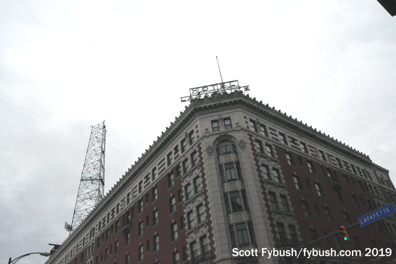 Look just a few blocks south from the Rand and you can see what remains of what was once a taller tower behind the Hotel Lafayette. This tower went up in 1953, an ambitious attempt to start a new UHF station, WBES-TV 59.
