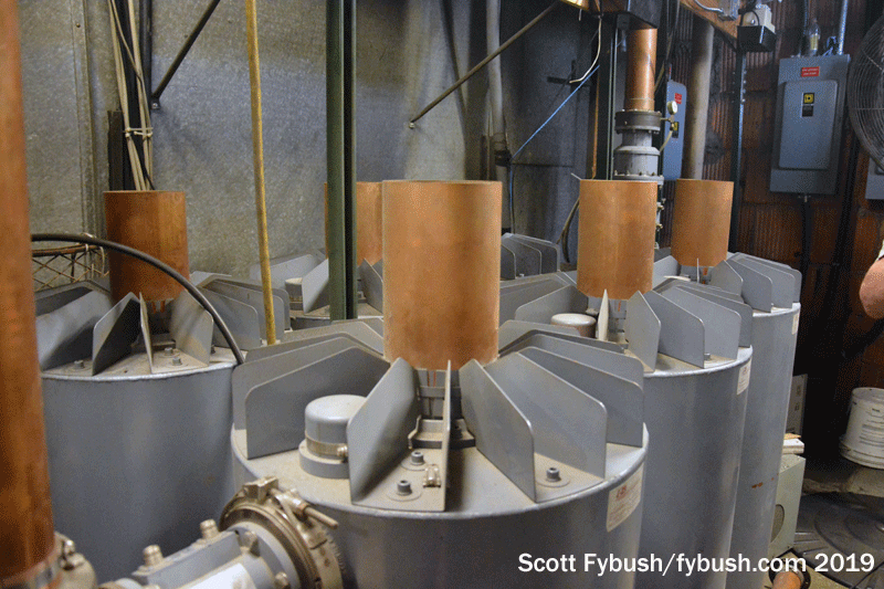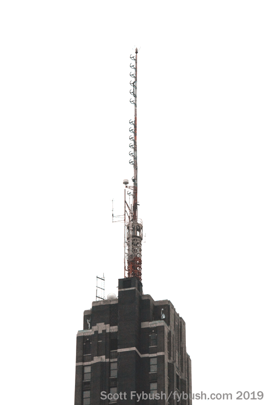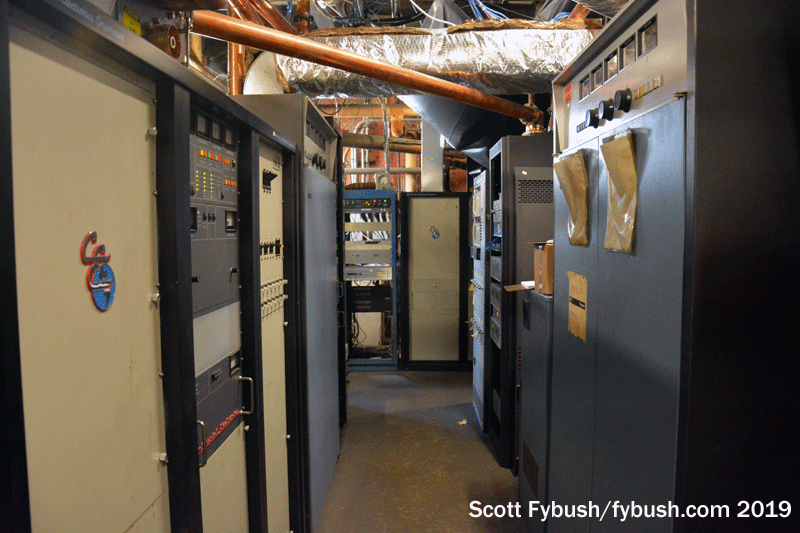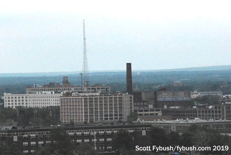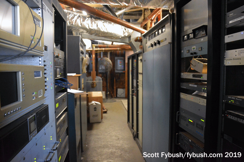 That combiner? It pairs WBLK and WMSX into the top six-bay antenna, while WYRK has sole use of the lower six-bay. There are aux antennas down lower for all three. WBUF, meanwhile, uses the tower behind the Elmwood Avenue studios of WIVB-TV, a few miles to the north – which brings us to another bit of Buffalo history we spent some time exploring.
