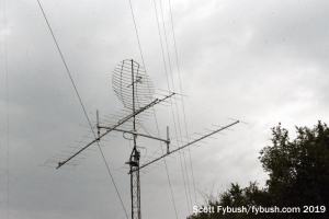 Bob has a deck up above the garage that provides an ice shield for the roof, a vantage point for some very nice views of the countryside, and an observation point for the big tower – and for Bob’s shorter tower on the house, where his TV and FM DX rig is set up for easy viewing of Indianapolis and Louisville stations, not to mention lots of much longer DX catches. (Check out his “Recorded FM History” page here!)