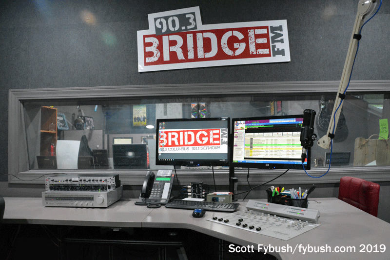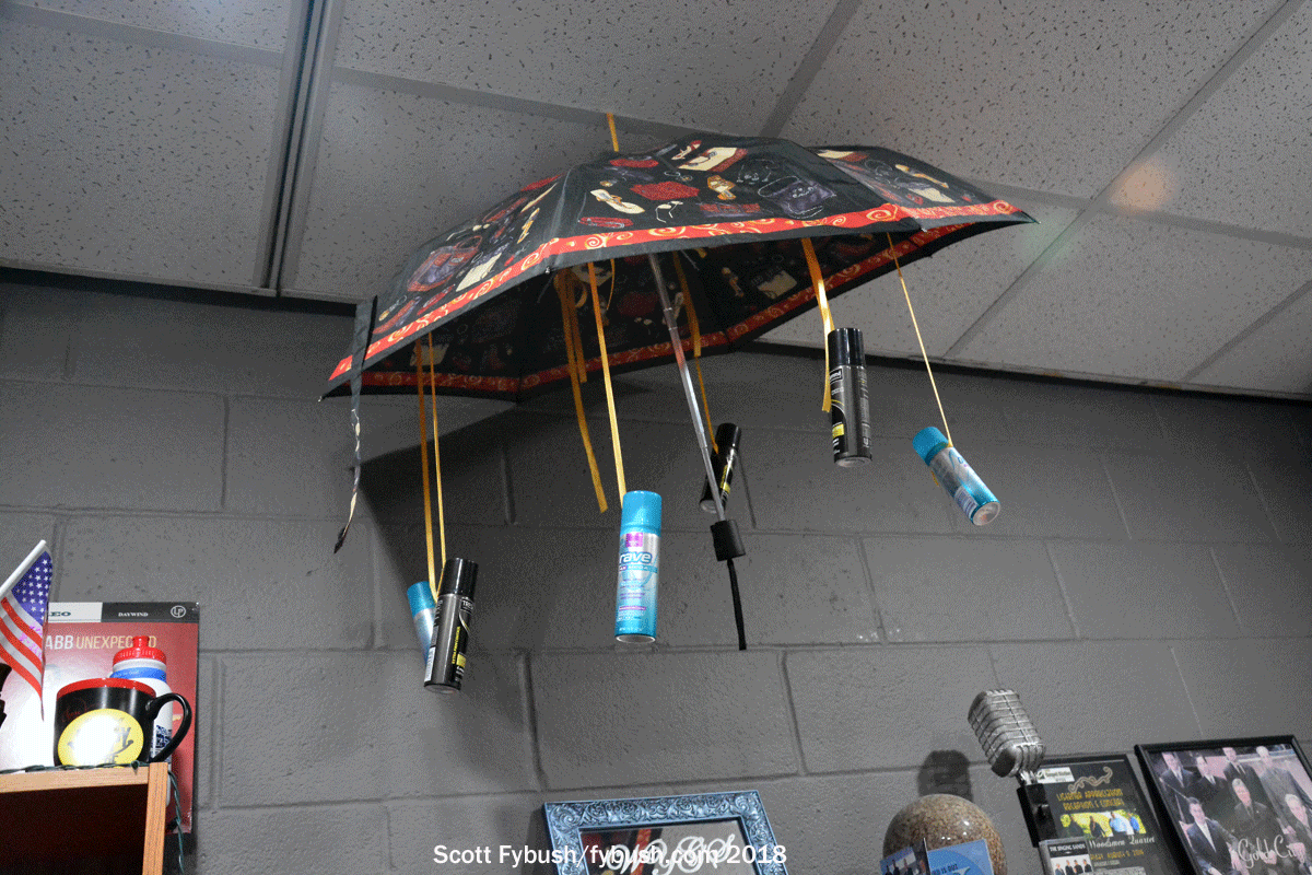 From the Bridge studio, the window looks into the smaller studio of its older sister, gospel WYGS (91.1), “Your Gospel Station,” complete with lots of quirky decorations. (Its morning host is apparently very proud of his hair – and a listener gifted him with that umbrella bedecked with cans of hairspray!)