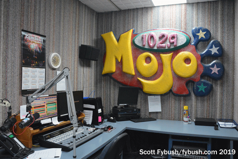 The studios around the corner behind QMIX have changed up since we were last here: WXCH (102.9) had just launched its “Mojo” oldies format when we visited in 2010, and its studio has been updated since; WYGB (100.3) is still doing country as “KORN Country,” but most of its studio facilities are now up the road in Franklin, closer to Indianapolis, leaving only a small production room down here.